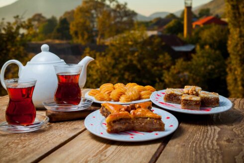 One fascinating aspect of Turkish tea culture is the tea gardens, or “çay bahçesi,” where friends and family gather to enjoy cups of tea while engaging in lively conversations. These tea gardens are social hubs where people come together, relax, and savour the aromatic flavours of çay. The tea is often accompanied by traditional Turkish delights or pastries, adding a delightful touch to the experience.